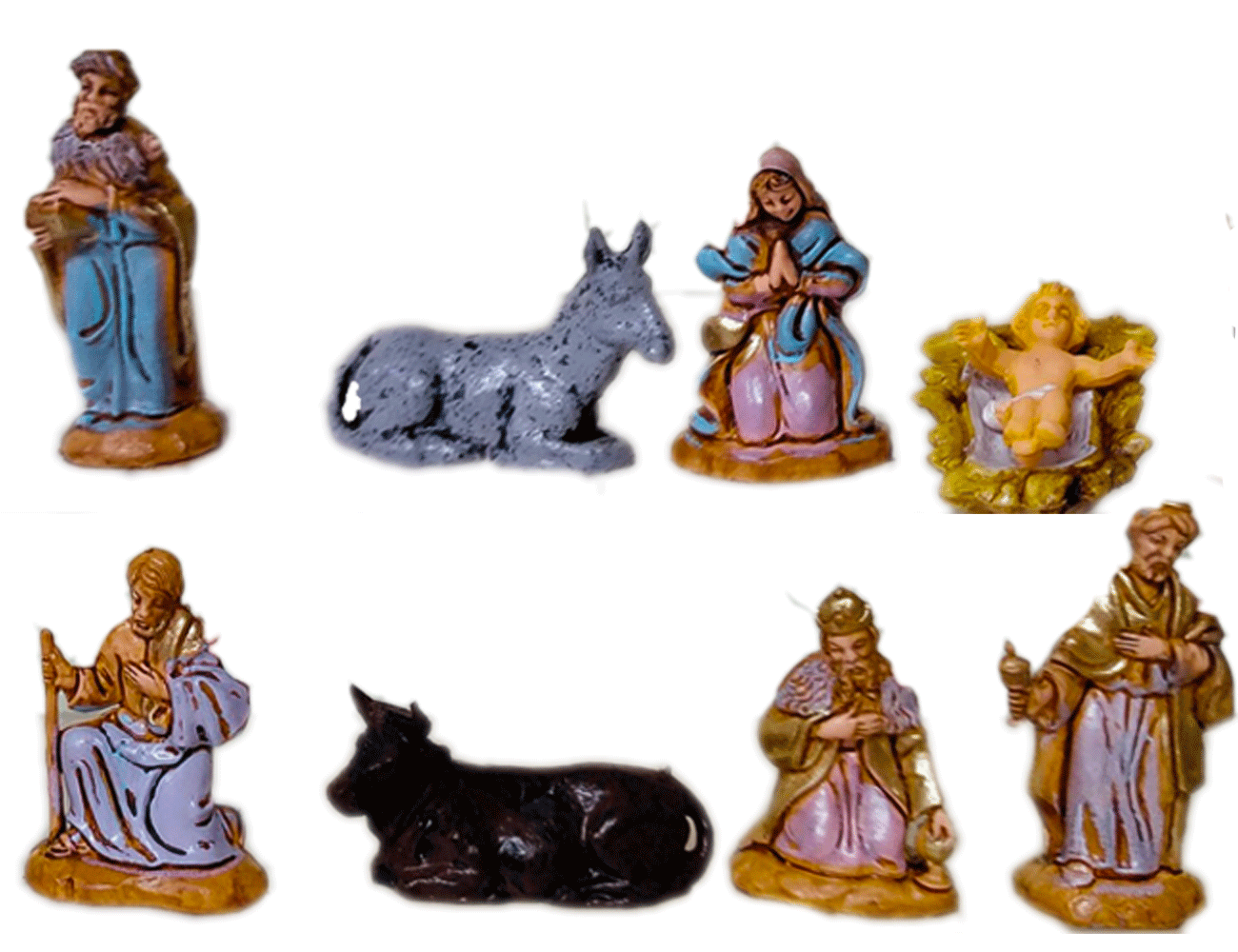 Figure Natività: Giuseppe, Maria, Gesù Bambino, Bue, Asino e Re Magi